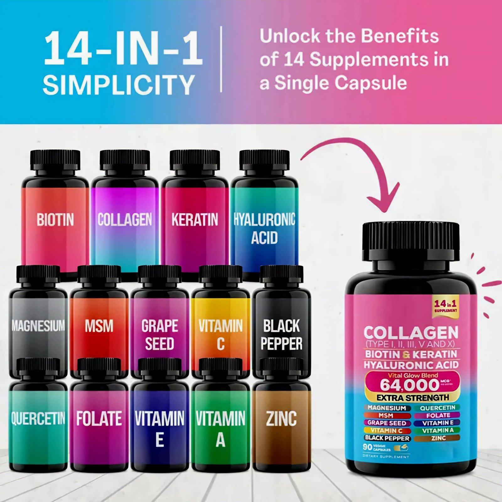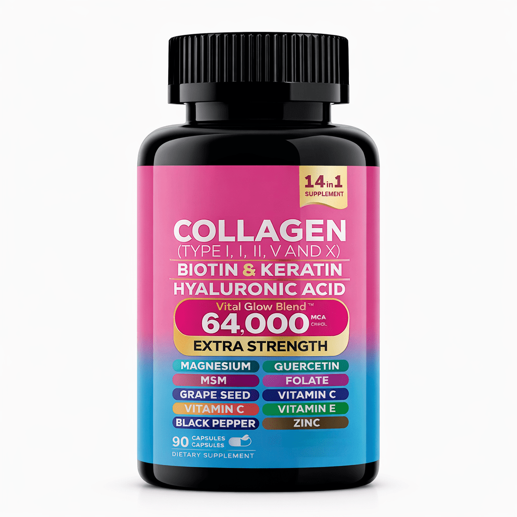 💫Experience the ultimate all-in-one beauty and wellness solution with the Complete Vital Glow Blend. This extra-strength, 64,000 MCG formula is designed to nourish your body at a cellular level, combining 14 essential vitamins, minerals, and proteins to support your hair, skin, nails, and overall vitality.